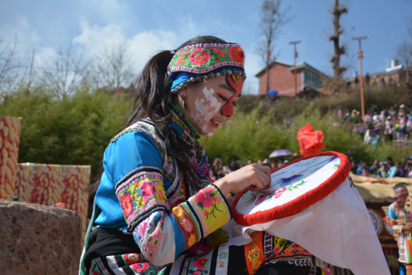 “小年来,描画春装绣五彩。”云南省祥云县的彝族少女面涂祈福图案,身着民族盛装,刺绣五彩图案,通过这种浓郁民族特色的方式祈福纳祥。(云南省祥云县纪委监委供 杨源忠 摄)