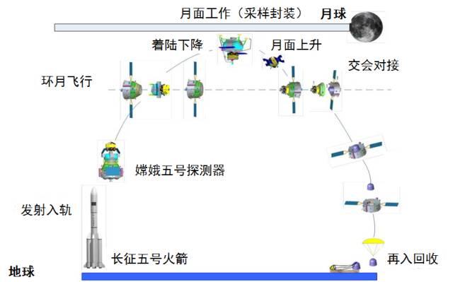 据嫦娥五号探测器副总设计师彭兢介绍,嫦娥五号将由长征五号火箭直接发射至地月转移轨道,先后经历发射入轨、地月转移、近月制动、环月飞行、着陆下降、月面工作、月面上升、交会对接、环月等待、月面转移和再入回收11个飞行阶段。
