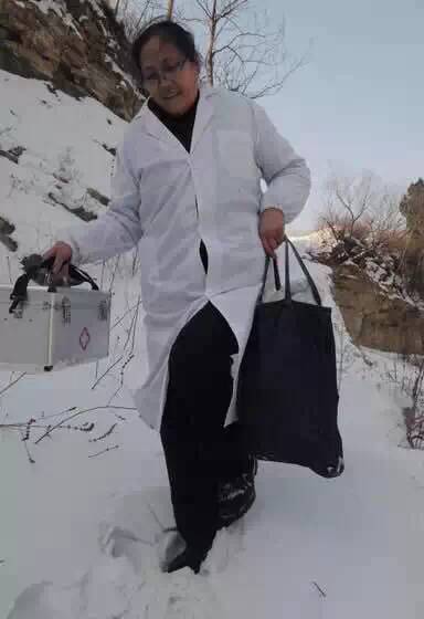 山东淄博市淄川区岭子镇双8峪村,60岁的孙凤莲给村民看病已经坚持44年了。图为走在积雪的山路上。