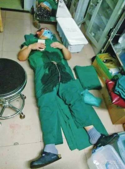 洛阳中心医院心外科主任陈兴彭,主刀一例高难度的手术,连续工作了23小时,最终圆满完成了手术,累得在手术室就地休息。