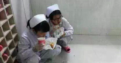 跨年夜,别人都在想如何欢庆,她们忙到凌晨。刚做完两场急诊,因为里面还有病人,不敢走开,于是就蹲在鞋区囫囵吃了起来——晚饭,不是夜宵!!