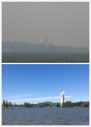 上图是2019年12月12日在澳大利亚堪培拉拍摄的雾霾笼罩的国家钟楼(新华社发,储晨摄);下图是2019年2月9日拍摄的国家钟楼(新华社记者白旭摄)。