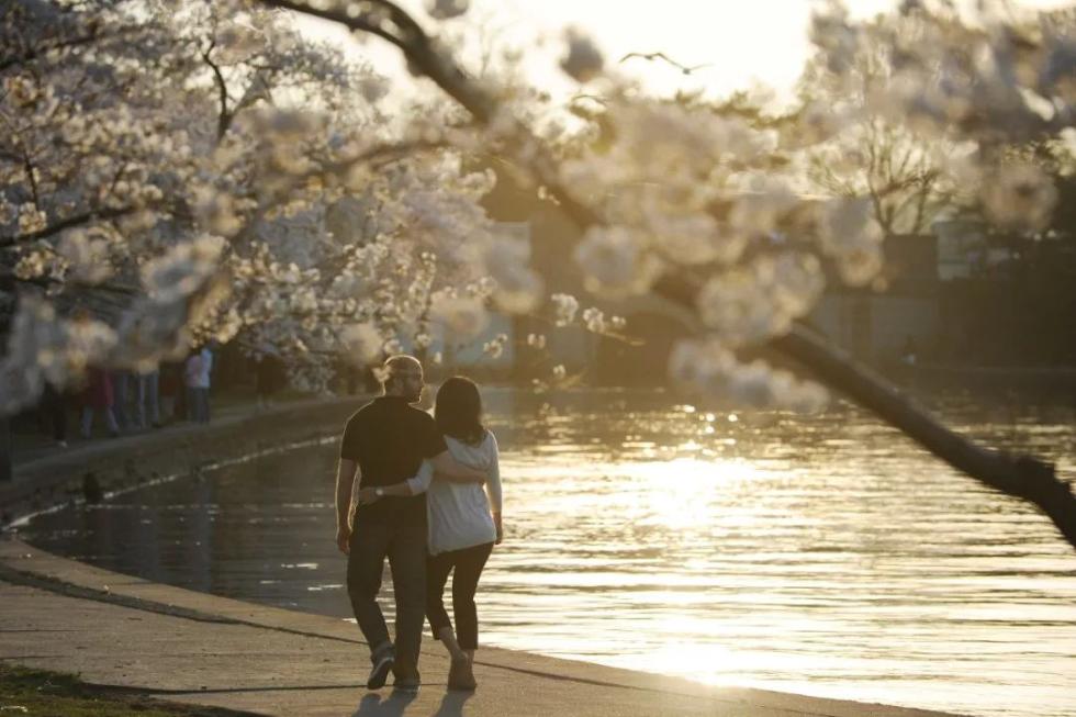 在美国首都华盛顿潮汐湖畔,一对情侣在盛开的樱花下散步。新华社记者张军摄