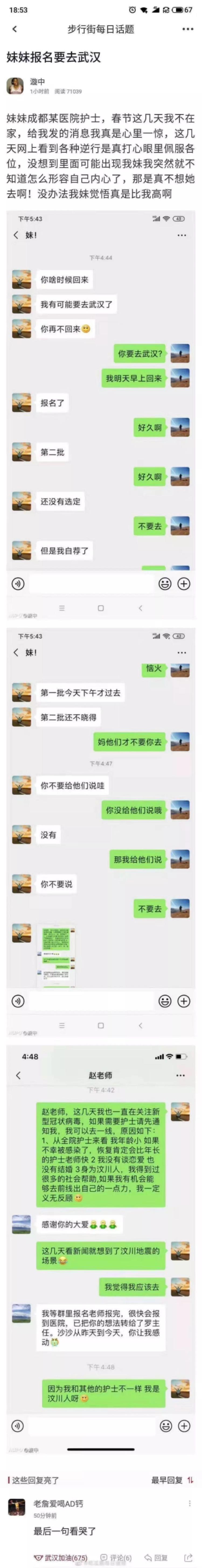 这样一段话,来自四川省第四人民医院内科四病区护士佘沙的微信。今年24岁的佘沙是2008年汶川地震幸存者,她见证了全国各地对灾区人民无私的援助。大年三十,医院征集援助武汉的第一批医护人员时,佘沙就积极报名请战,但由于第一批选派的是重症监护室和呼吸科的护士,她没有去成。1月25日医院发布召集第二批医疗队成员的通知,她又主动报名请战。