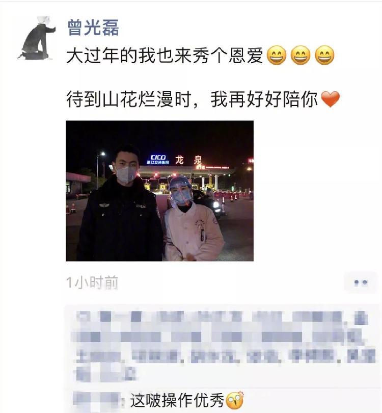 而这对夫妻的短暂相遇,换来了所有人的感动,浙江省龙泉市公安局民警赶往所里值班,在高速路口遇到防控检疫人员,而给他检测体温的护士不是别人,正是他的新婚妻子,“待到山花烂漫时 我再好好陪你”,是祈祷和祝愿,更是爱的承诺 。
