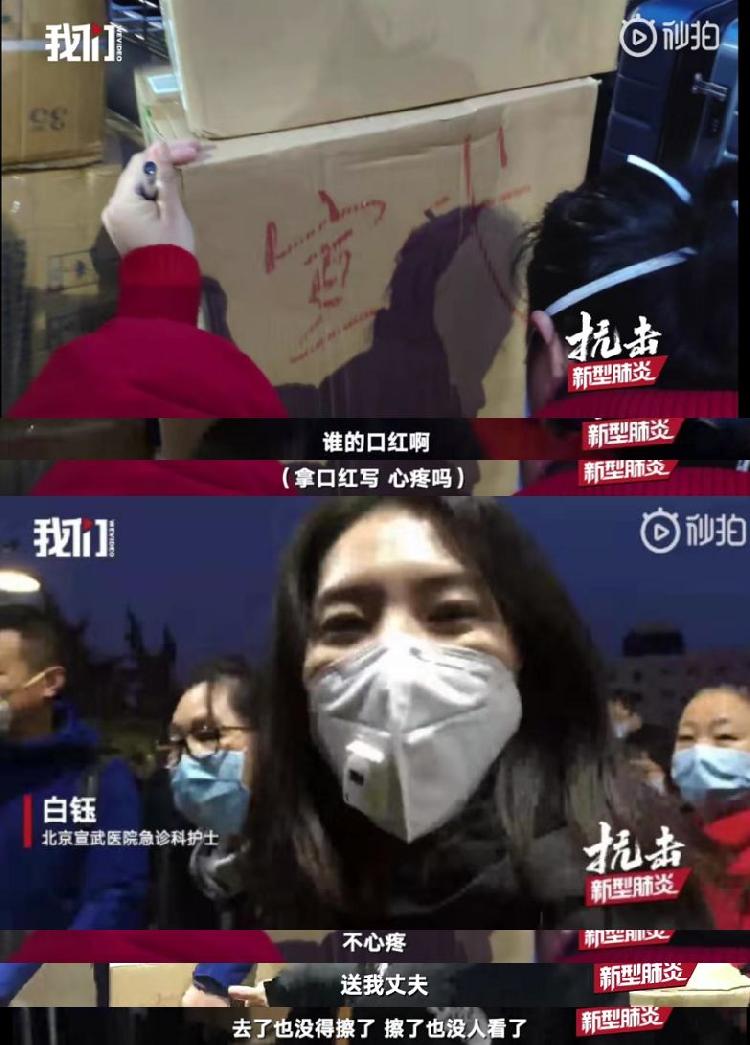 1月27日,北京市属医院驰援武汉医疗队出发,由于出发匆忙没来得及拿笔,来为出征的丈夫送行的护士小姐姐,掏出自己的口红给救援物资做标记,“不心疼,去了也没得擦了,擦了也没人看了”,小姐姐,此刻的你,真的很美丽。