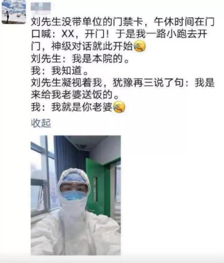 “我是来给我老婆送饭的”,“我就是你老婆”.....武汉刘医生因低烧,被主任强令回家休息,当天中午他打完针,又跑来给同为医护人员的妻子送饭,却发现忘记带门禁卡,按了门铃正好是妻子来开门,两人隔着防护服,夫不认妻,可爱混杂着一丝心酸,包裹在笑声里。