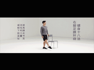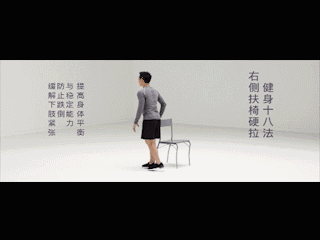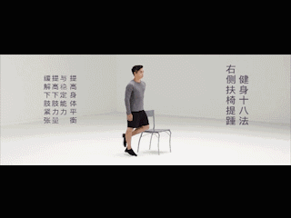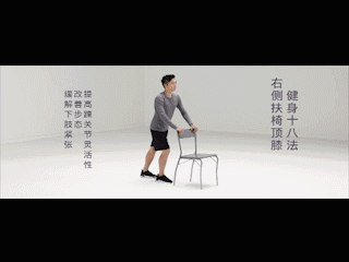 单腿站姿抓脚面, 腿在躯干靠后点, 降低难度扶椅背, 缓解腰部紧和酸。