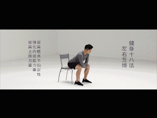 双脚与肩同宽站, 向后下蹲屈膝慢, 双手向前水平伸, 触椅站立重复练。