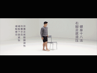 单腿赤脚踩球上, 双手扶稳身不晃, 顺时逆时各三圈, 慢慢滚压足底爽。