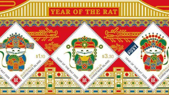 澳大利亚邮政发行农历鼠年系列邮票,来自悉尼的华裔设计师林妍受到中国传统戏曲艺术——京剧的启发,设计了一套以京剧元素为主题的鼠年邮票↓