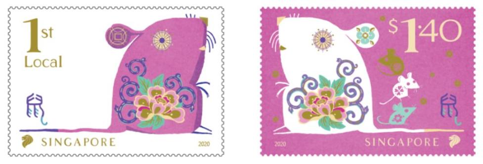 新加坡鼠年邮票以玫红色和白色为主色调,绘制的小老鼠端坐于地面,胖胖的身躯上画着盛开的牡丹,耳朵上绘有外圆内方的铜钱↓