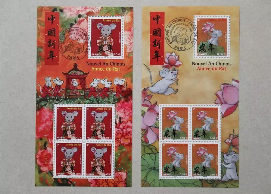 法国邮政发行“鼠票”全套2枚,图案分别为“老鼠与莲花”和“老鼠新娘”。该套邮票由法籍华裔画家陈江洪设计↓