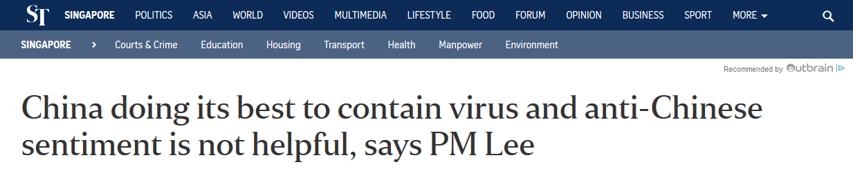 新加坡《联合早报》也说,李显龙致辞时对民众表示,“你在网上或许也会看到一些网民纷纷抵制中国人,这是错误的心态,也是很不好的做法。希望大家了解这不是一个国籍甚至是种族的问题,而是公共卫生问题。”