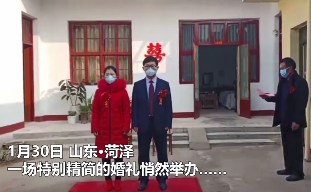 婚礼现场仅一对新人、新郎父母及主婚人参加。
