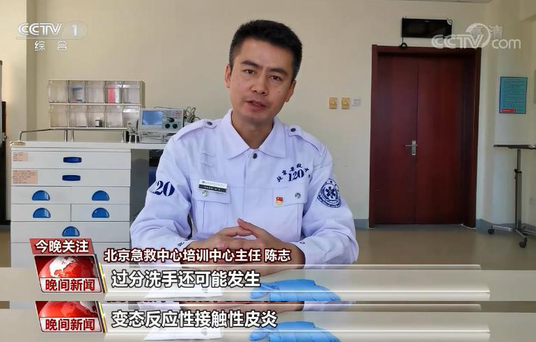 北京急救中心培训中心主任陈志:勤洗手会带走皮肤上的油脂,损伤皮脂膜,过分洗手还可能发生变态反应性接触性皮炎。所以在勤洗手的同时,我们也要保护好双手皮肤。洗完手呢,手要充分擦干,然后用护手霜均匀涂抹,适当按摩。如果手部出现皲裂瘙痒,可佩戴手套工作。很多人对乳胶手套过敏。可以选择不含乳胶的纯棉手套,或者是丁腈手套。尽量的避免接触其它化学品,让手部的皮肤有一个充分休息的时间。