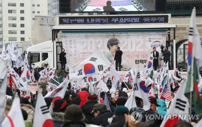 2日下午,朴槿惠支持者在首尔南大门举行集会(韩联社)
