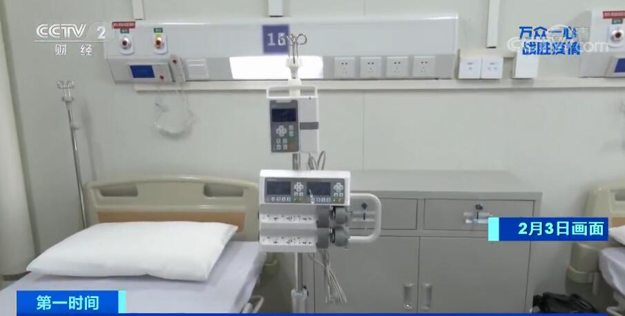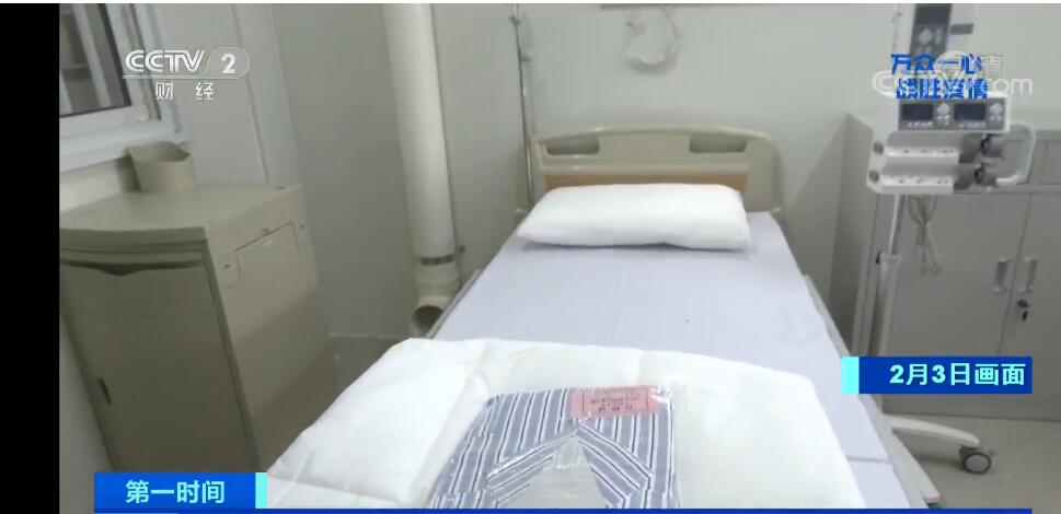 总台央视记者 苏洲:在正式接受患者之后,我们的医务人员就要在这里进行对患者的救治,首先医护人员会来到这样的一个缓冲间,其中包括了洗手的措施,和防护物品的摆放,医护人员在这里进行个人的防护,比如说戴口罩、手上的消毒还有穿防护服,之后就会进入我们的病房。现在我们可以看到各项工作已经准备完毕,其中有被褥,病号服包括一些医务用品,比如注射泵、氧气、床边呼叫机。