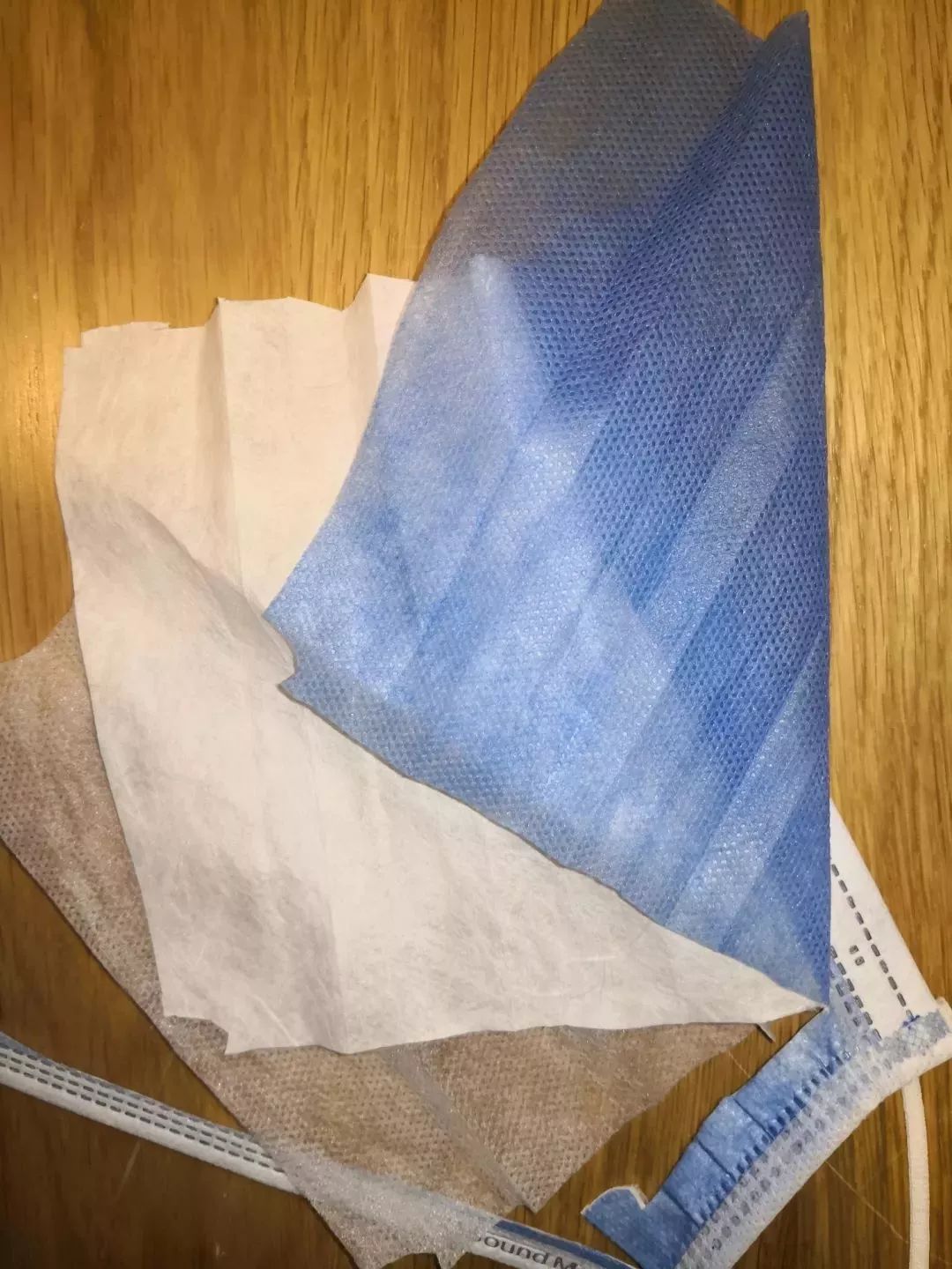 来,看下图,最底下那层半透明的,是吸湿的;中间白色那层,是阻隔气溶胶的,这是口罩最重要的一层;最上面蓝色的这层,是防飞沫、体液、血液等喷溅物的。