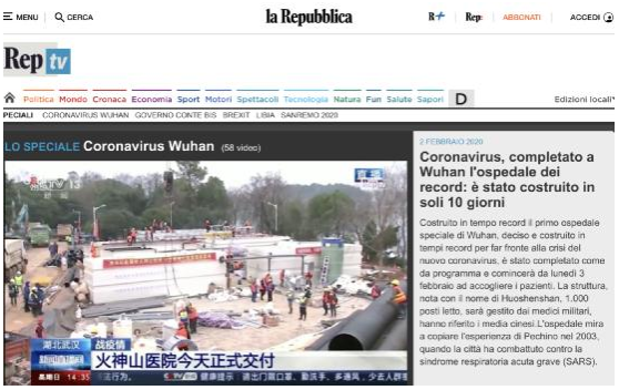 意大利《共和国报》网站报道武汉火神山医院正式交付使用,感叹为抗击新型冠状病毒,这座医院在10天的时间内得以建成,文章的视频观看量超过18万次。