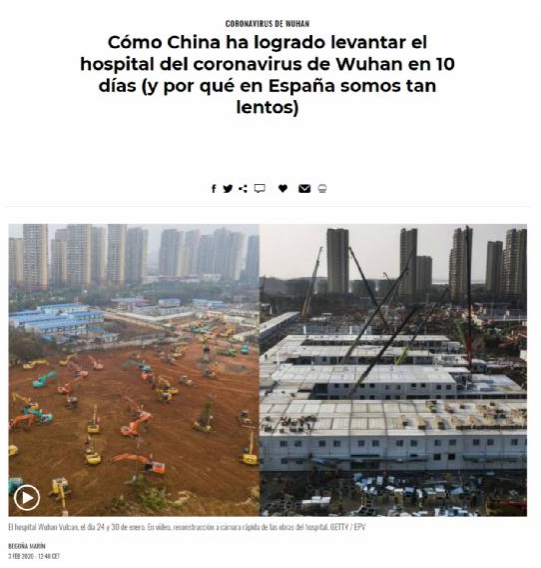 △2020年2月3日,西班牙《国家报》发表题为《中国如何在十天内建成医院》的文章