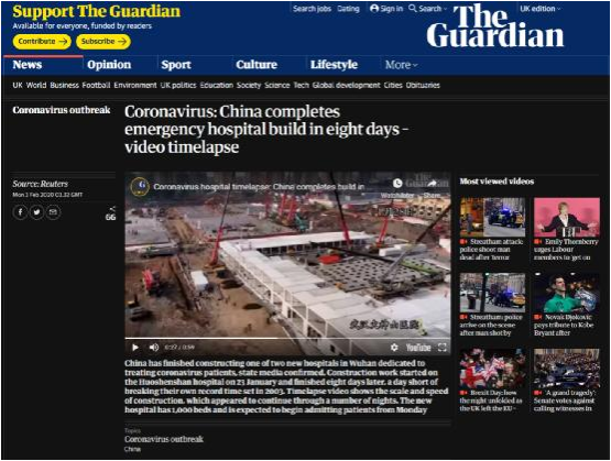 △英国《卫报》转载总台火神山医院建设延时拍摄视频