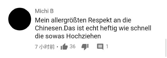 德国网友Michi B表示:“超级佩服中国人。动作真迅猛,这么快就能盖起来。”