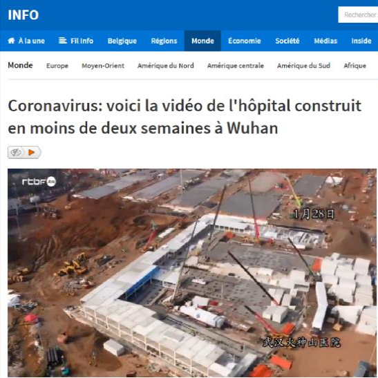 比利时法语区国家电视台 RTBF关注武汉火神山医院在两周内建成。