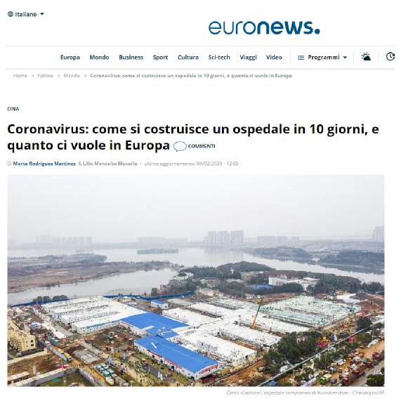 欧洲新闻台网站意大利语版发表文章,以《新型冠状病毒:如何在10天内建起一座医院 在欧洲又需要多久?》为题,对建筑专业人士的采访,与欧洲国家进行的工程建设所需的时间进行比较,讲述了中国建设模式作为成功范例的优势,指出了这一过程中政府强大的决策能力的重要性。