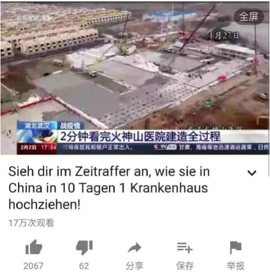 德国《图片报》发布名为《延时视频:中国如何用10天建好医院》的短片,一夜之间视频播放量达17万次,数千名网友为视频点赞留言。