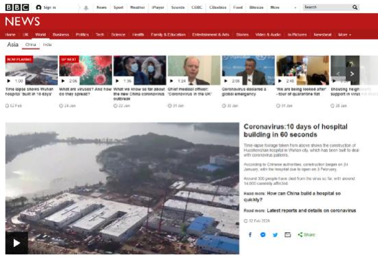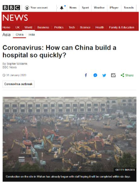 2月2日,一段60秒的火神山医院延时拍摄视频迅速登上各大欧洲主流新闻网站,它曾一度成为BBC网站收看人数最多的视频。