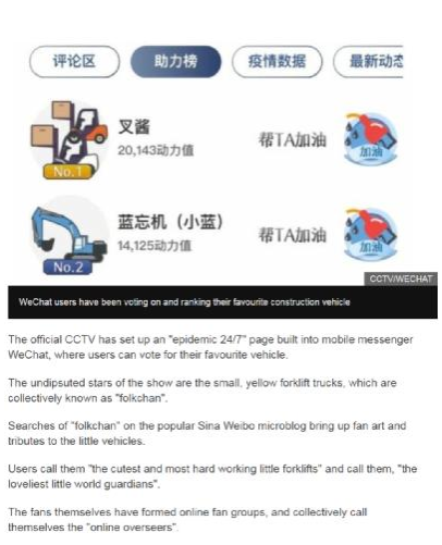 武汉火神山和雷神山两所医院加紧建设过程中,英国广播公司BBC还关注了施工现场慢直播所凝聚的抗击疫情中积极乐观的力量。‘叉酱’‘焊舞帝’等登上了热搜榜,网友时刻关注着武汉,以积极乐观的方式,向着战场逆行的建设者们在线加油。