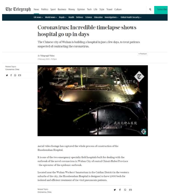 △英国《每日电讯报》发布火神山医院建设的延时拍摄视频