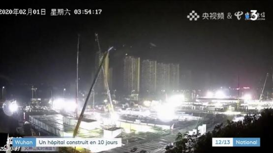 法国国家电视3台播出央视频慢直播镜头及总台CGTN画面,介绍武汉火神山医院的建成情况及内部设施。