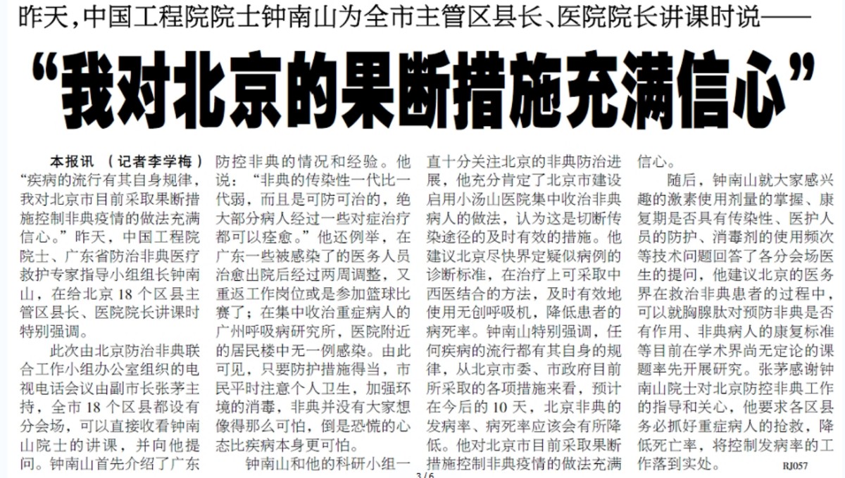 钟南山和他的科研小组一直十分关注北京的非典防治进展,他充分肯定了北京市建设启用小汤山医院集中收治非典病人的做法,认为这是切断传染途径的及时有效措施。(2003年5月4日《北京日报》2版,《“我对北京的果断措施充满信心”》)