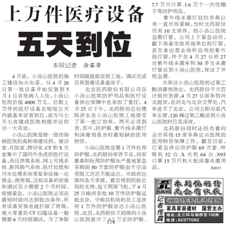 紫外线杀菌灯在“抗非”战役中一直市场紧缺,当时北药公司仅有10支库存,而小汤山医院急需灯管。公司上下紧急动员,甚至拿出营业场所自用的紫外线灯管,终于在4月27日将27台紫外线杀菌车和30多支杀菌灯管送到小汤山医院,保证了开院急需。(2003年6月20日《北京日报》2版,《上万件医疗设备五天到位》)