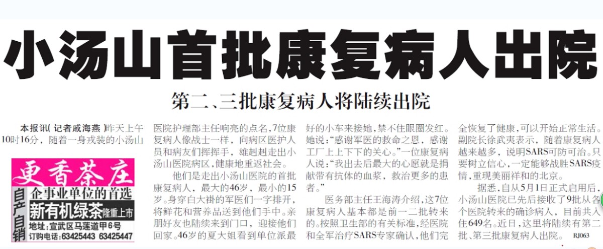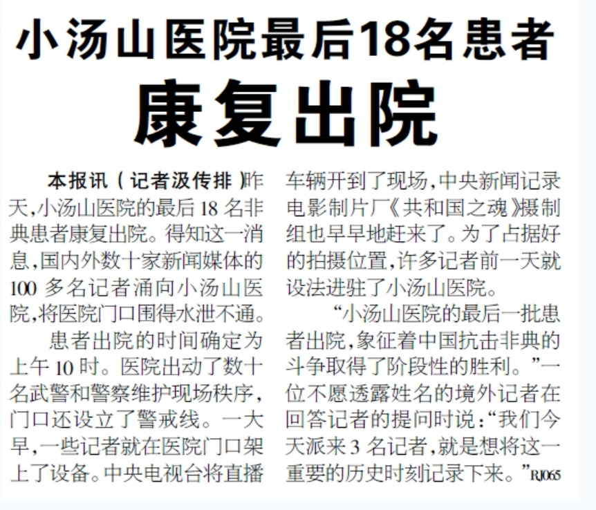 2003年6月20日,小汤山医院最后18名非典患者康复出院。在扭转北京“抗非”战局中发挥了关键作用的小汤山医院,圆满完成了历史使命。(2003年6月21日《北京日报》2版,《小汤山医院最后18名患者康复出院》)