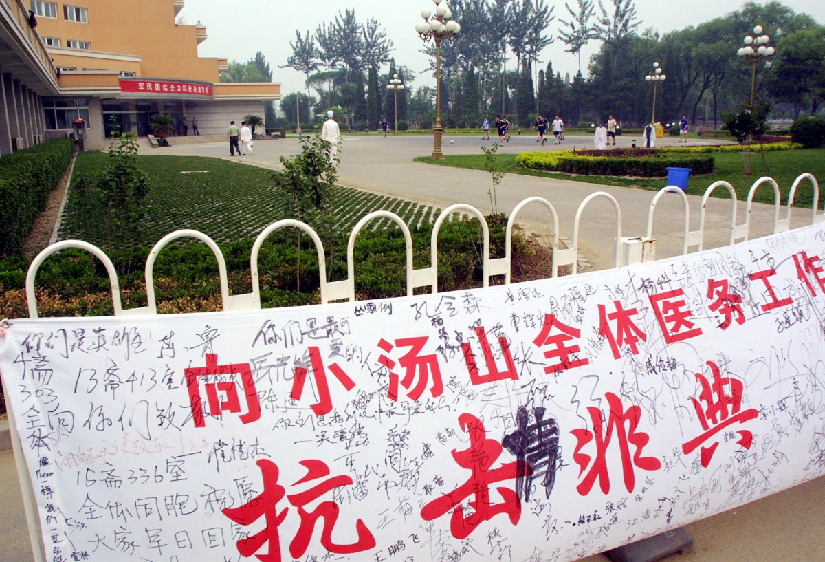2003年小汤山医院外,挂起了向医护人员致敬的横幅,很多人在上面签字。 孙戉/摄