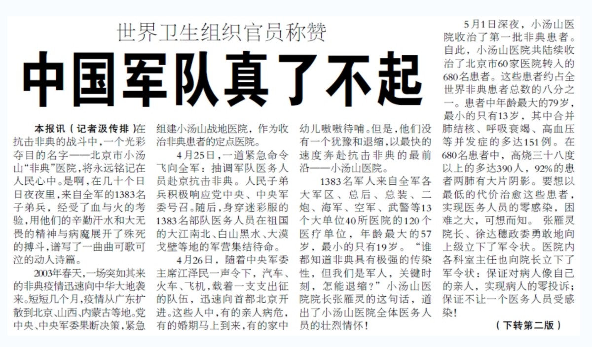 6月3日,世界卫生组织的官员专程来到小汤山医院考察,对小汤山医院的救治工作给予了充分肯定。一位官员说:“小汤山医院创造了世界奇迹,中国军队真了不起!”(2003年6月20日《北京日报》1版,《中国军队真了不起》)