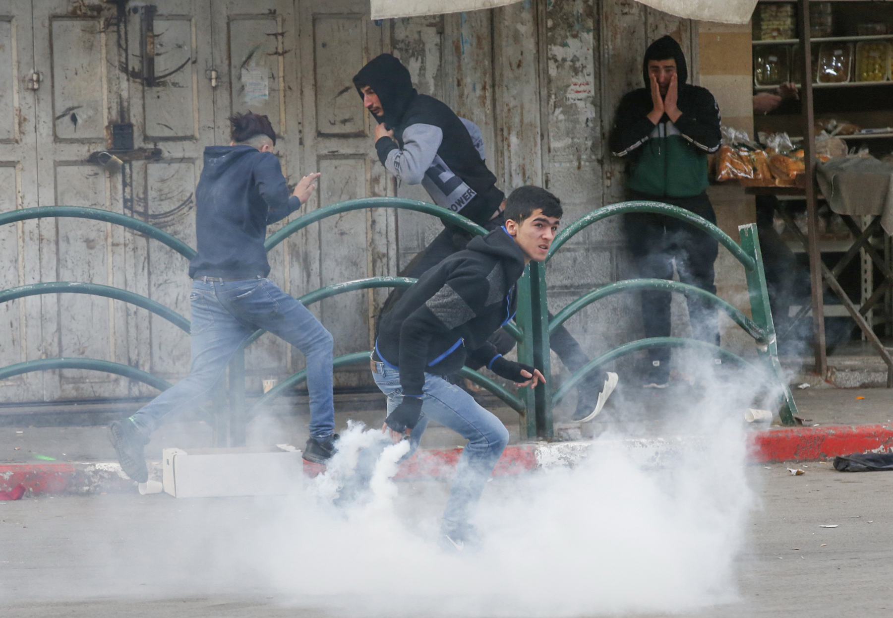 2月6日,在约旦河西岸城市希伯伦,巴勒斯坦人在冲突中躲避催泪瓦斯。新华社/法新