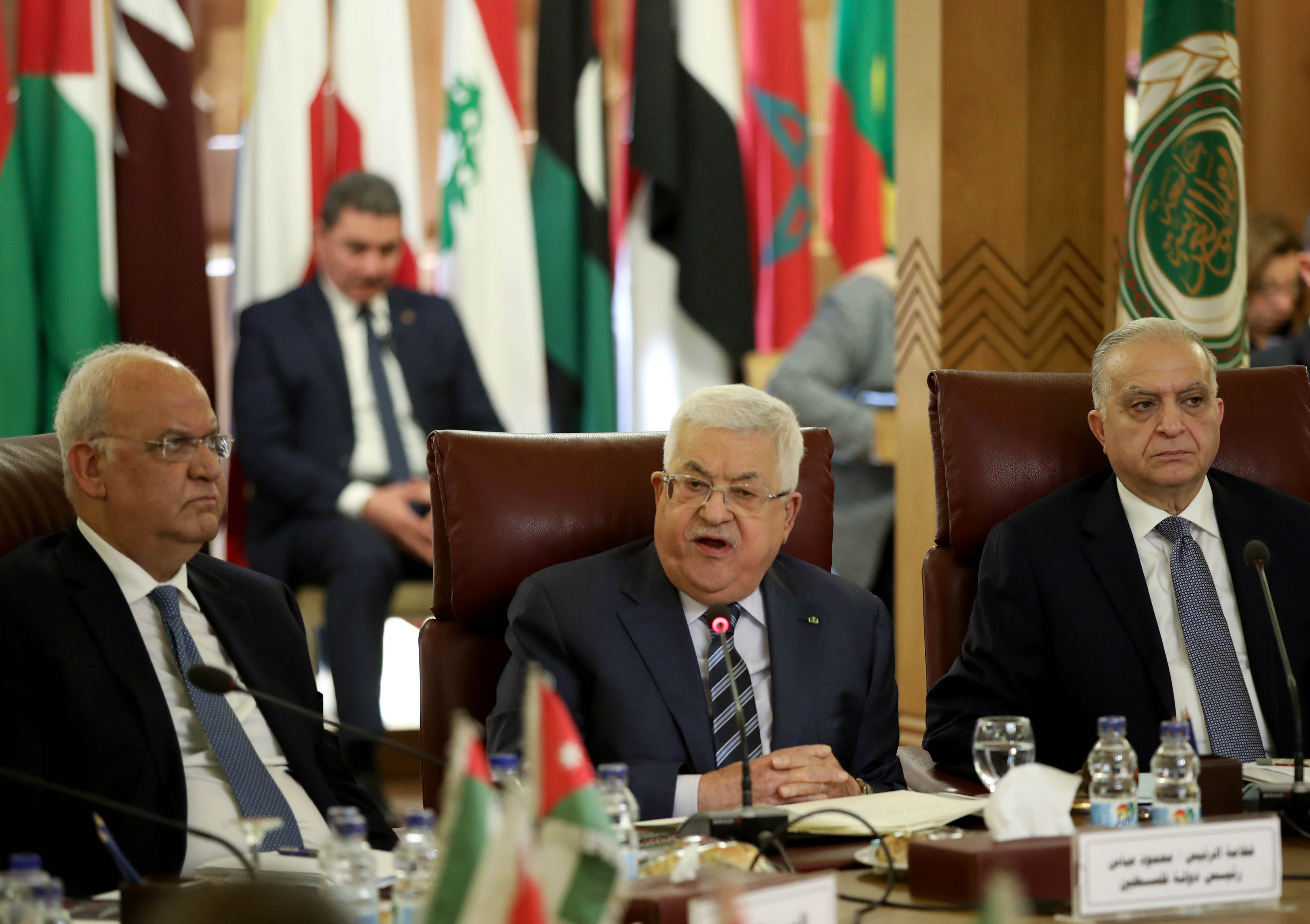 2月1日,在埃及开罗,巴勒斯坦总统阿巴斯(中)出席阿盟紧急外长会议。阿巴斯在会上表示,巴方拒绝接受美国政府提出的“中东和平新计划”,并将断绝与以色列和美国的一切关系。新华社发(艾哈迈德·戈马摄)