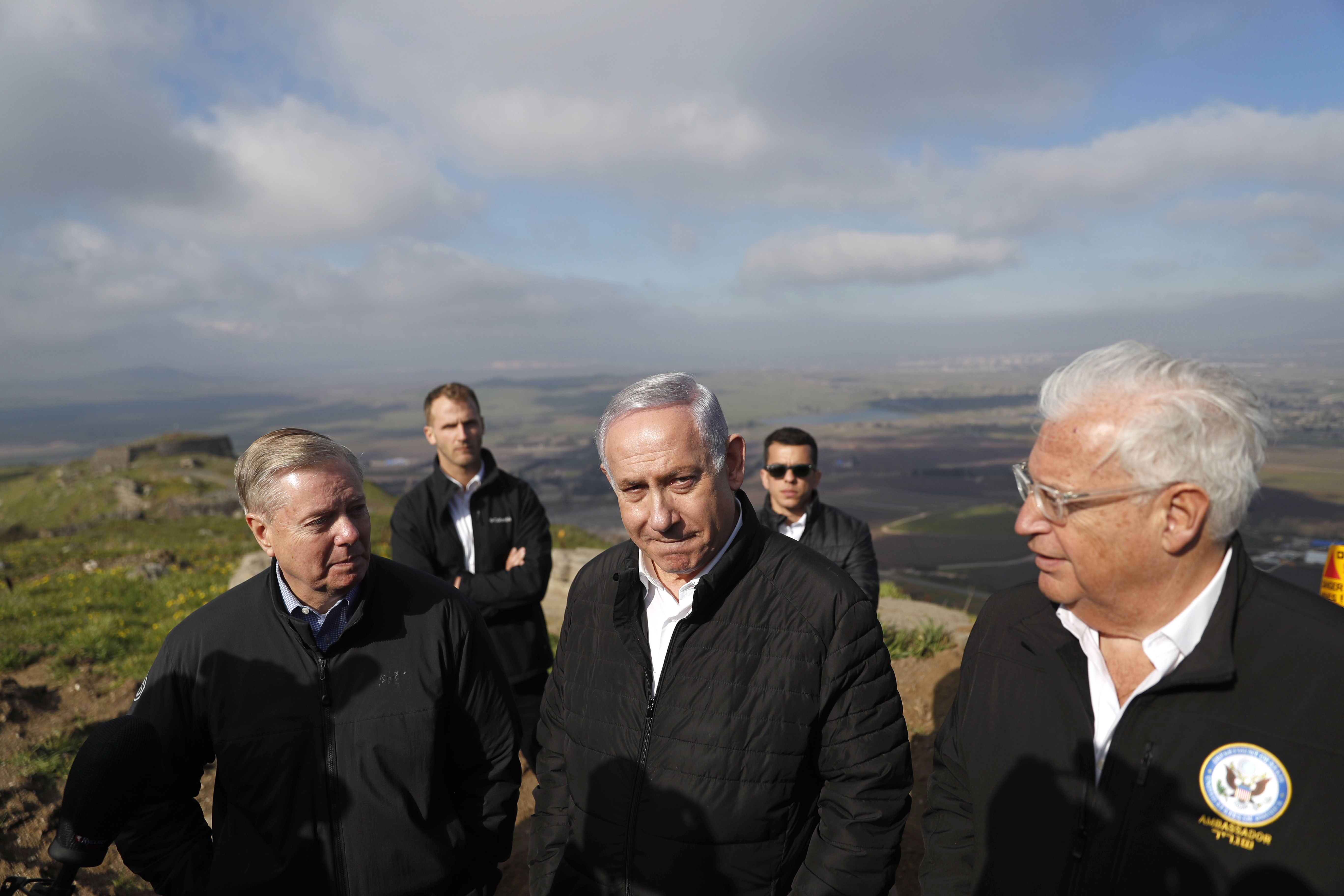 2019年3月11日,以色列总理内塔尼亚胡(中)、美国共和党参议员林赛·格雷厄姆(左)和美国驻以色列大使戴维·弗里德曼(右)共同参观戈兰高地。新华社/美联