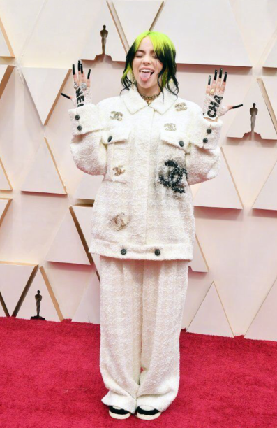 耳环、项链、蕾丝手套、胸针等处都有着CHANEL大写的LOGO,但是配合上“碧梨”的绿色挑染发色和吐舌搞怪,竟然将象征着优雅的“小香风”变得如此嘻哈。