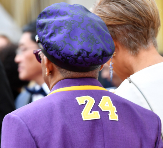 显然,这身服装造型师是在缅怀前段时间因直升机事故而陨落的篮球巨星科比。紫金配色是科比所效力的湖人队的标志性配色,24正是科比的球衣号码。