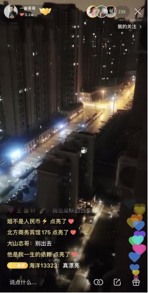 每晚直播结束前,崔建宾都会带老铁们看下武汉的夜景,这是他们不成文的规定。打开窗户,武汉的街灯很明亮,但街道很安静。而屏幕那头的老铁们静静地看着,突然有人说了句“不是滋味”,其他人都跟着回复“武汉加油”