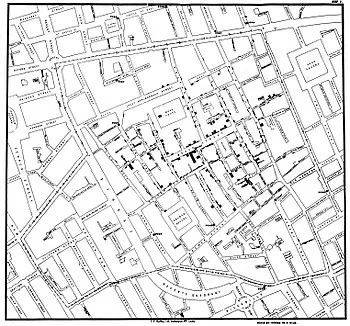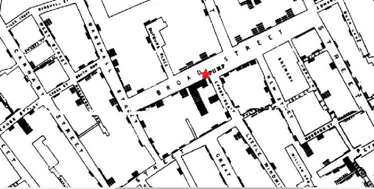 伦敦苏活区霍乱爆发地图(其中黑点为死者居住地址)