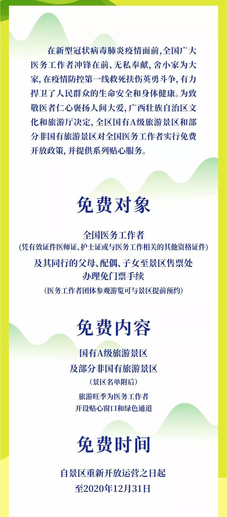 2月15日,广西文旅厅发布重磅消息,广西旅游景区对全国医务工作者及其家属实行全年免费,景区名录来啦,一起去看看吧!