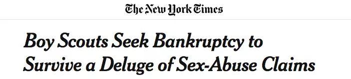 原来,美国童子军组织(Boy Scouts of America)因童子军被性侵而面临数百起诉讼,涉及八千名受害者,早已不堪负荷。 而申请破产后,该组织可以将所有诉讼整合到一个案件中,通过集体诉讼来尽可能保障每个受害者的权益。