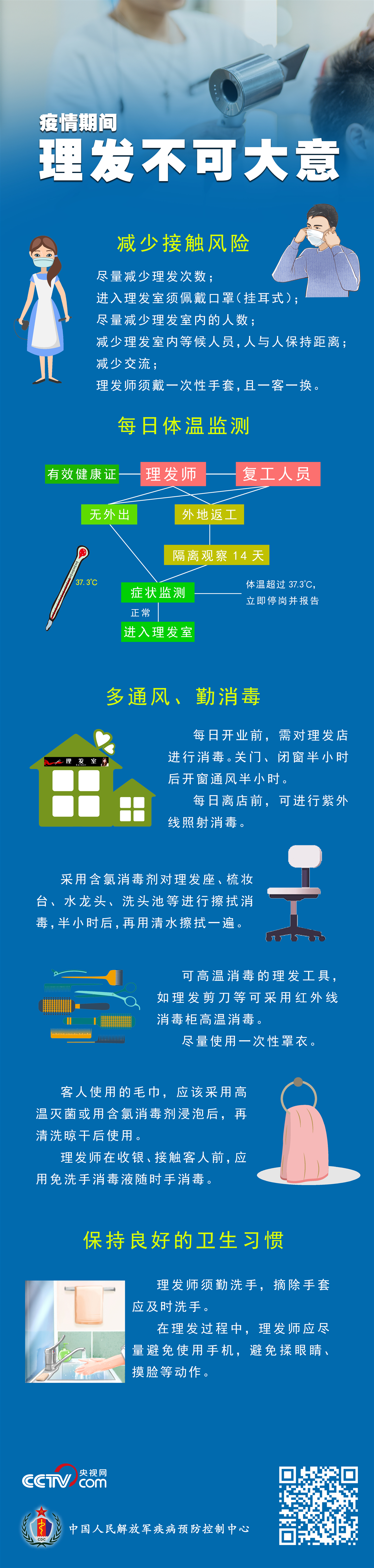 随着复工复产潮的到来,以及居家隔离时间的延长,人们的理发需求变得越来越迫切。为避免疫情传播风险,解放军疾病预防控制中心专家提醒您,外出理发不可大意,需要注意这几点。