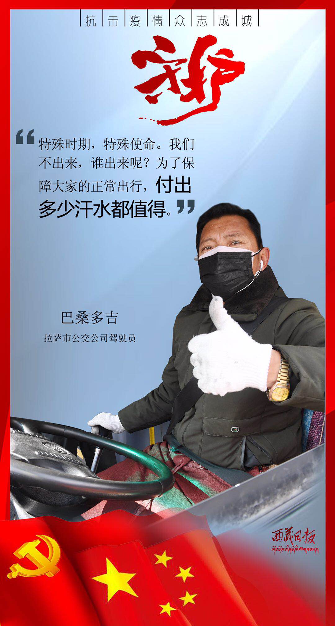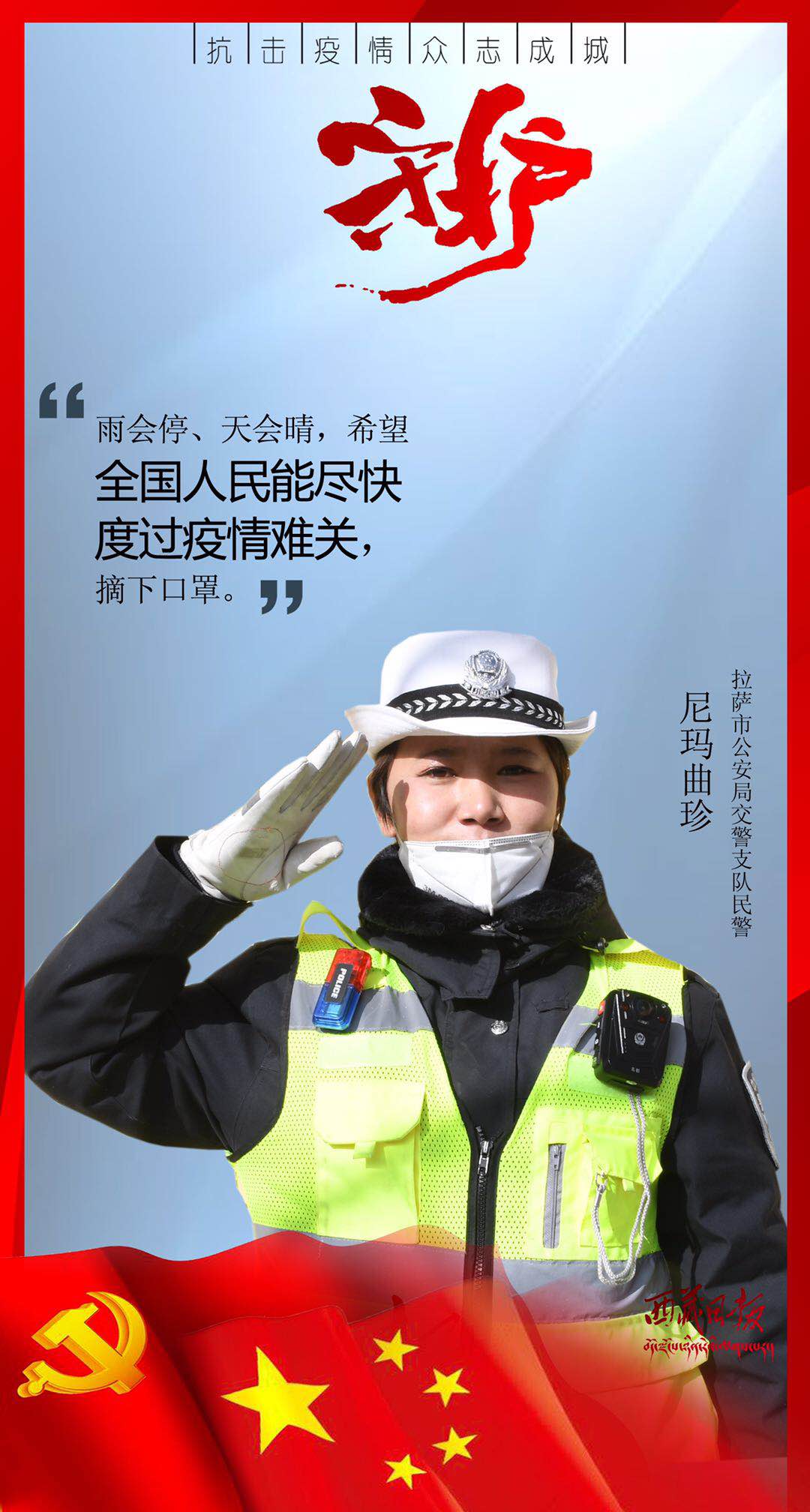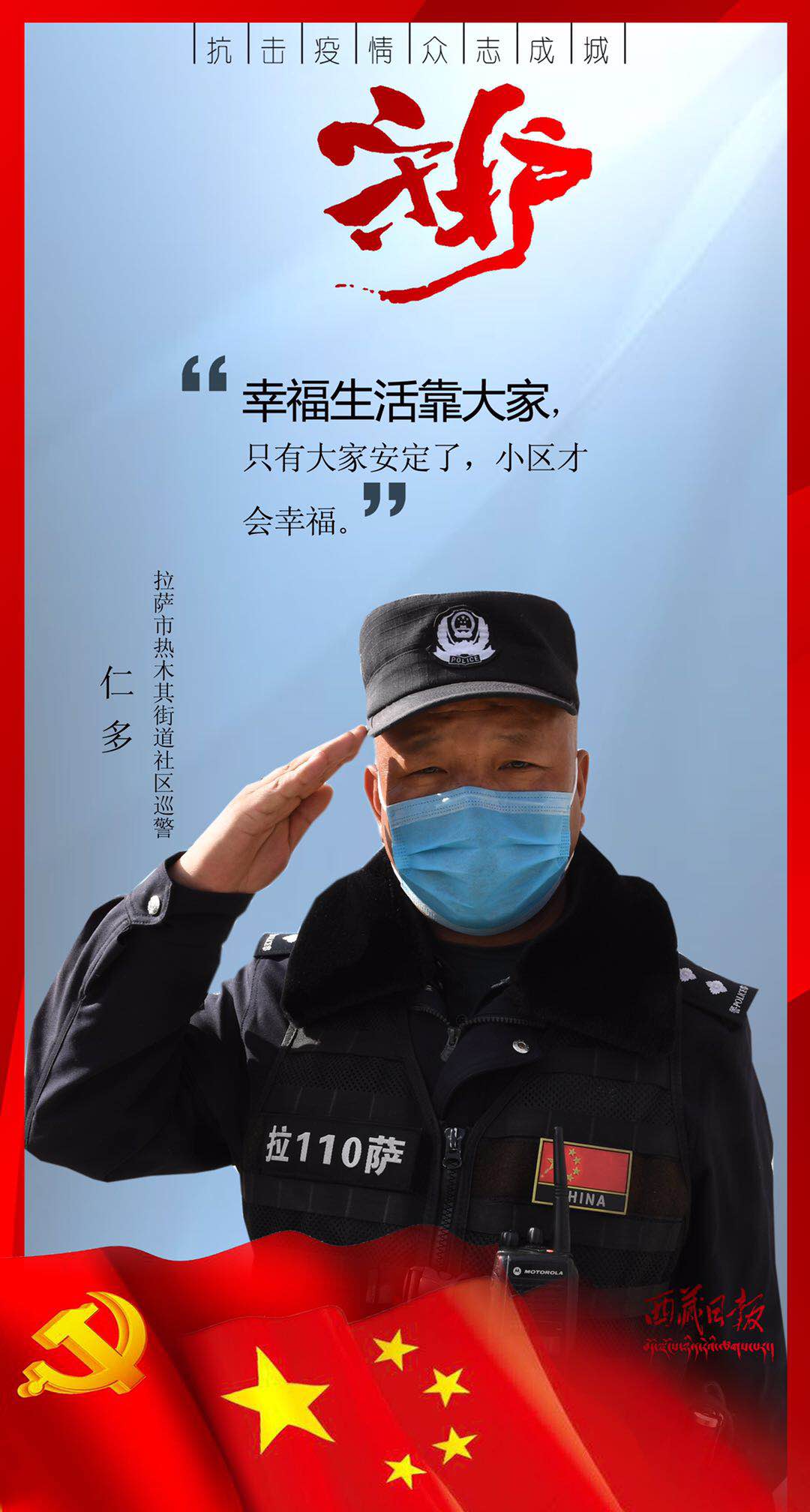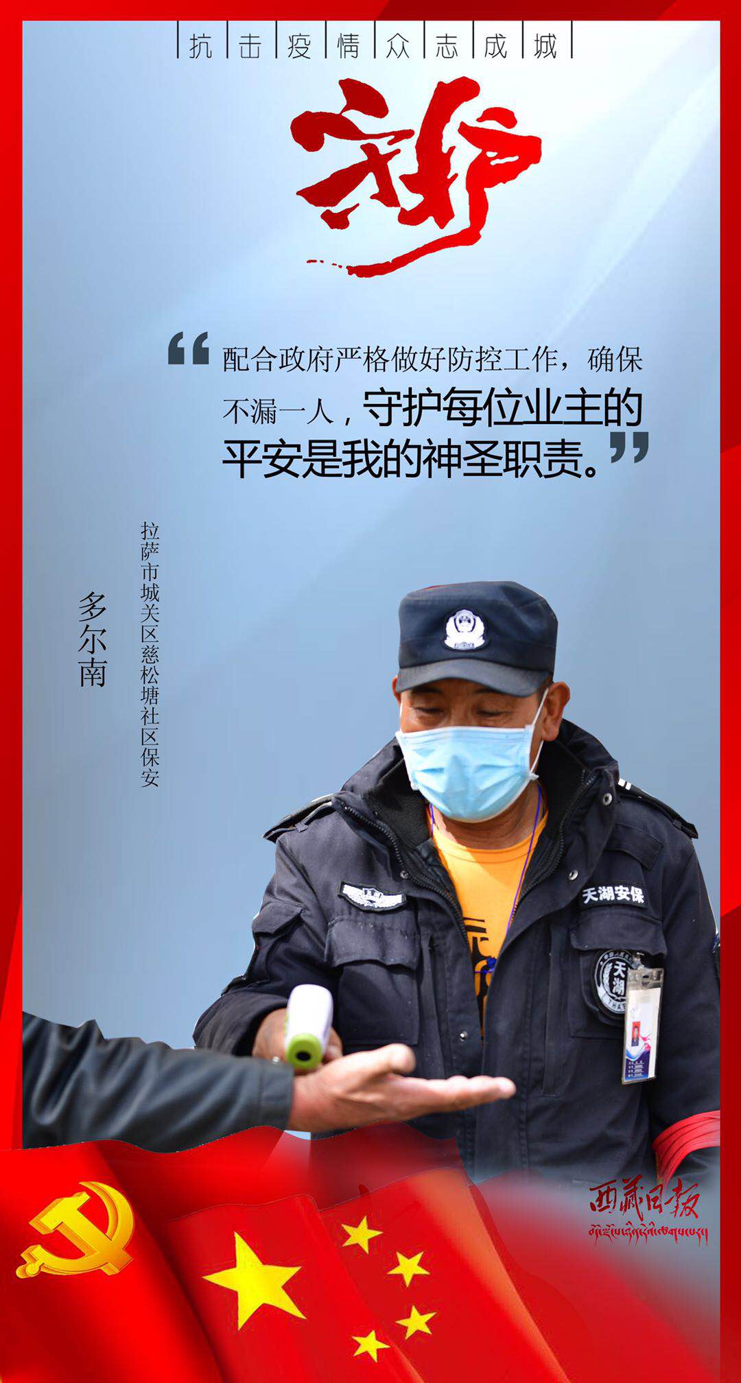 疫情来袭,有这么一群人,或临危受命,或主动请缨,用贴心呵护生命,用爱心守护平安,筑起了雪域高原抗击疫情的最强防线。在医疗救治一线,他们舍身忘我、无私无畏,与病毒进行生与死的对抗;在交通管控一线,他们顶风冒雨、日夜坚守,守护疫情防控第一道关口;在农村社区一线,他们马不停蹄、走村入户,严而有情为隔离人员嘘寒问暖;在生产保供一线,他们坚守岗位、加班加点,为满足疫情防控和群众生产生活必需物资而全力以赴……丹心照雪域,正气满乾坤。是他们用有力行动顶住了疫情冲击、用无私奉献守护了人民安康、用暖暖真情传递了人间大爱。他们是疫情防控最有担当的勇士,是城市守护最有魅力的使者,是新时代最可爱的人。
